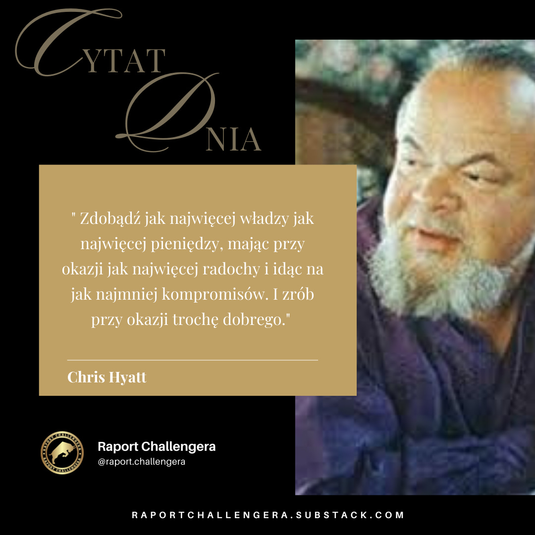 Cytat Chrisa Hyatta: "Zdobądź jak najwięcej władzy i jak najwięcej pieniędzy, mając przy okazji jak najwięcej radochy i idąc na jak najmniej kompromisów. I zrób przy okazji trochę dobrego" to inspirująca droga do zbalansowanego życia. Przypomina mi, że można dążyć do sukcesu, cieszyć się życiem, być wiernym swoim wartościom i nie zapominać o innych. Dla mnie to idealny przepis na satysfakcjonujące życie, pełne sukcesów i radości.