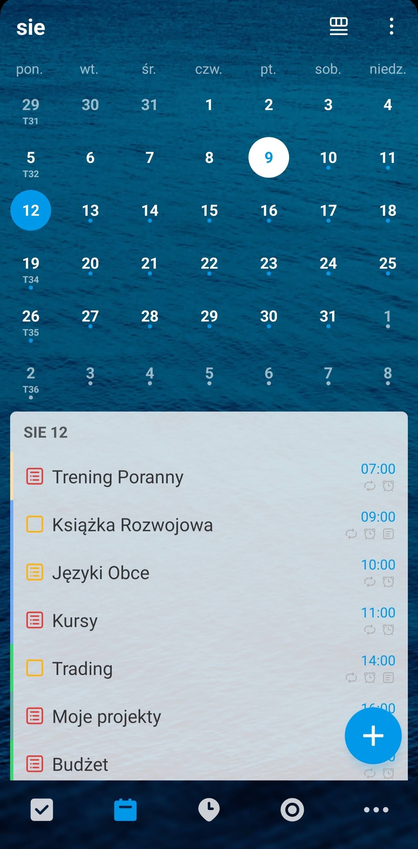 Największą zaletą TickTick jest to, że możesz podzielić swoje zadania na kategorie. Ja mam na przykład takie jak: Trening i Zdrowie, Finanse, Biznes, Edukacja i Rozwój Osobisty. Każda kategoria ma swoje konkretne zadania, zaplanowane na daną godzinę. Przykładowo, w kategorii Edukacja ustawiam czas na kursy, które chcę zrobić. Dzięki temu nie mam poczucia, że coś mi umyka – bo wiem, że wszystko ma swoje miejsce i czas.